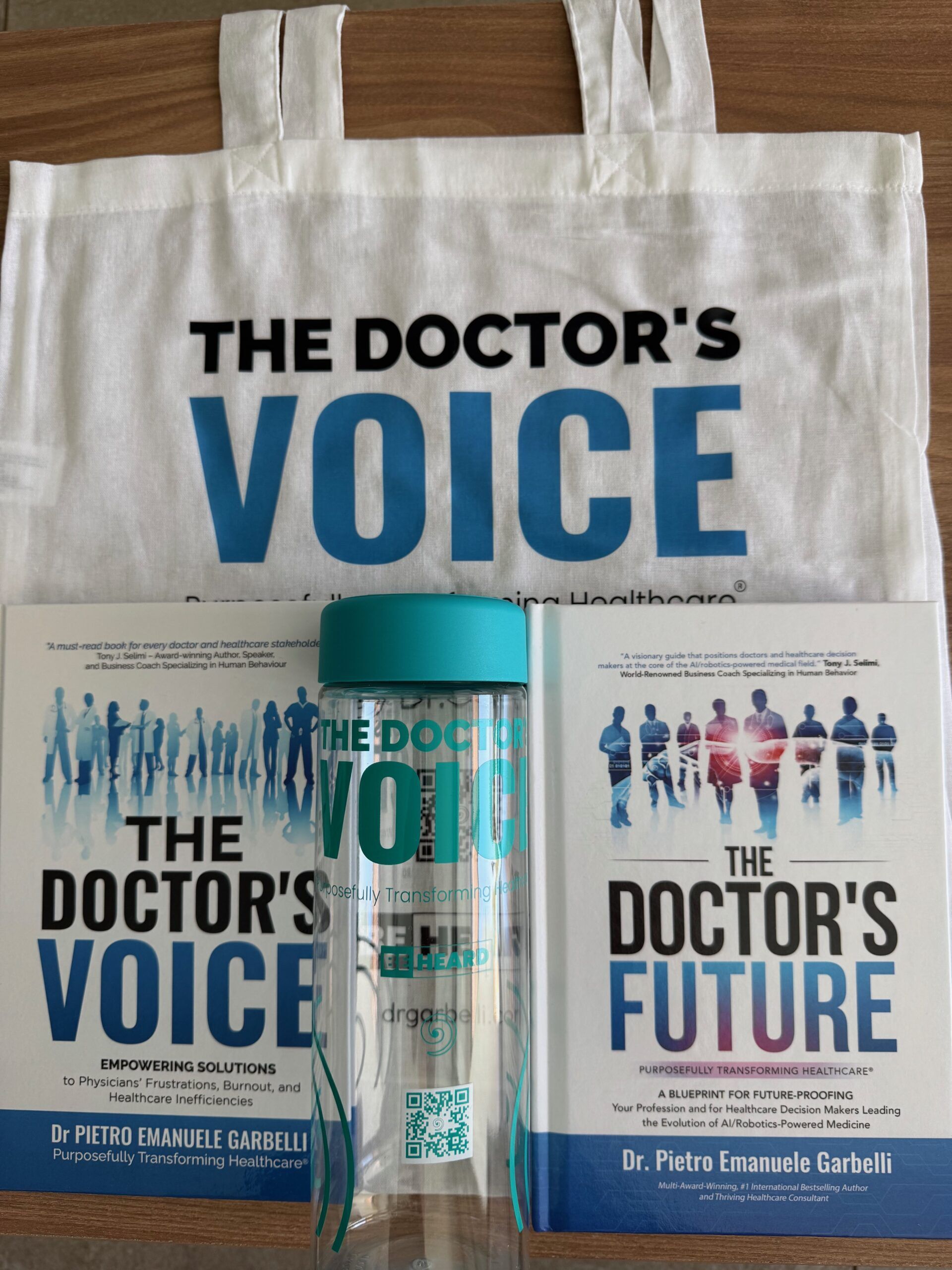 Author-signed hardcover copies of The Doctor’s Voice and The Doctor’s Future books by Dr Pietro Emanuele Garbelli, plus 850ml non-toxic transparent plastic reusable bottle.