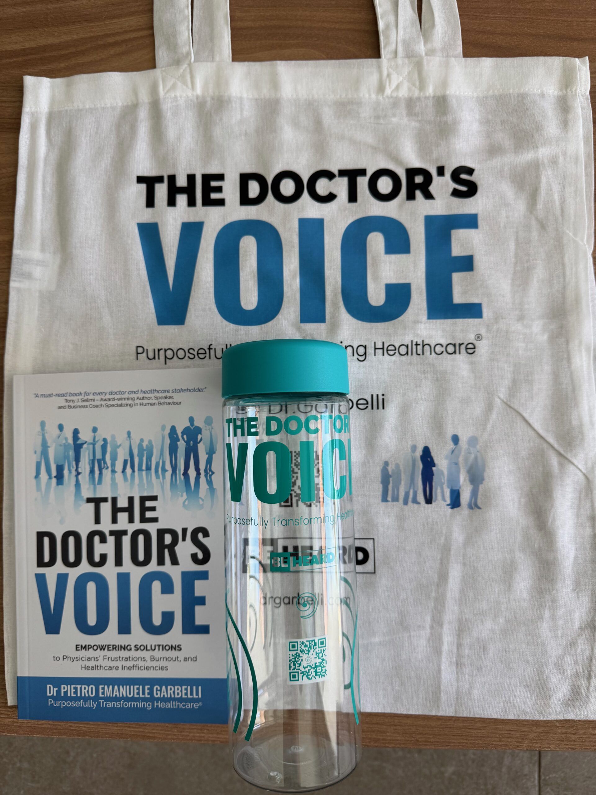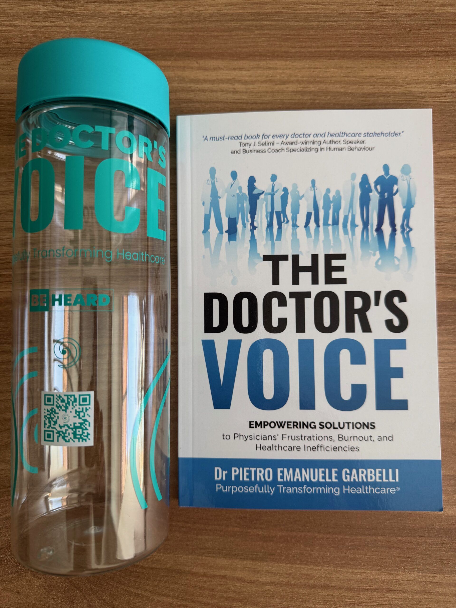 Author-signed softcover copy of The Doctor’s Voice book by Dr Pietro Emanuele Garbelli, plus 850ml non-toxic transparent plastic reusable bottle.